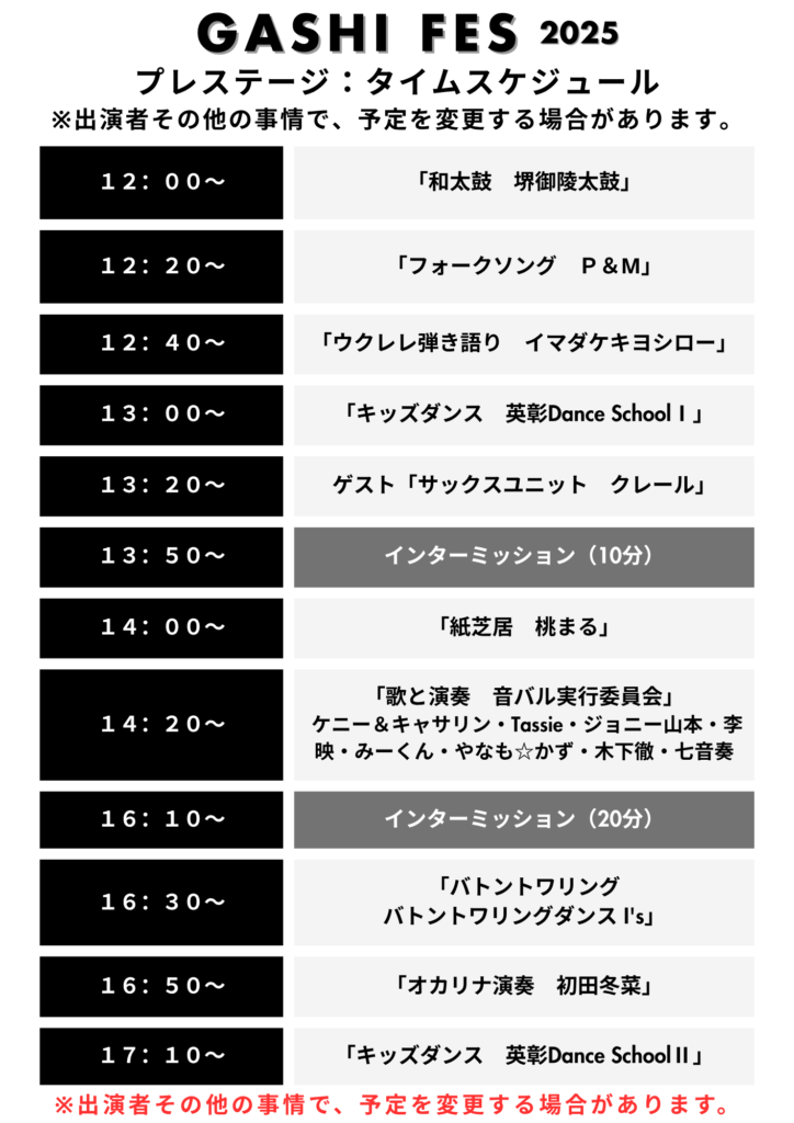 第17回ガシフェス 堺東夏まつり 2025 プレステージ出演発表! This entry was posted on 2025年7月24日 【出演者情報 発表!】 「第17回ガシフェス 堺東夏まつり 2025」の開催に先立ち、この度、プレステージへの出演者が決定いたしましたので、お知らせいたします! 第17回のガシフェスを彩ってくださるのは、様々なジャンルの出演者の皆様です! ガシフェス実行委員会一同、夏の堺東をさらに熱く盛り上げていく所存です。 当日は、迫力あるパフォーマンスにご期待ください! ※「出演者その他の事情で、予定を変更する場合があります。」